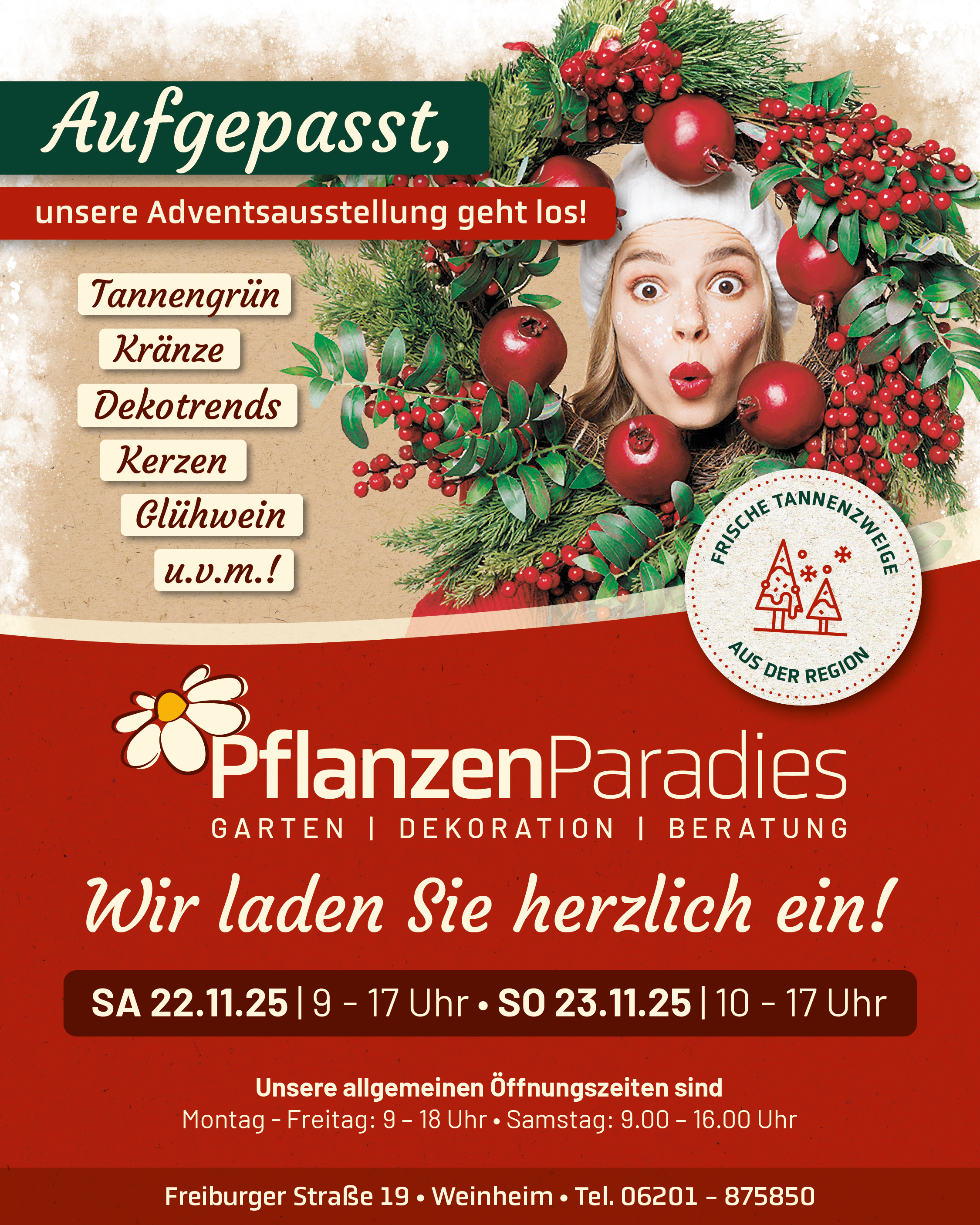 Adventsausstellung 2025 im Pflanzenparadies Bei Kerzenlicht und Weihnachtsdekoration wird der diesjährige Adventsmarkt eröffnet. Lassen Sie sich von Lichtern, Glitzer und