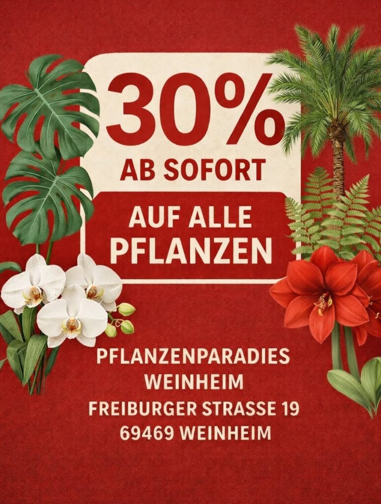 Adventsausstellung 2024 im Pflanzenparadies Liebe Kundinnen und Kunden, wir laden Sie herzlich zu unserer diesjährigen Adventsausstellung im Pflanzenparadies Weinheim ein! Lassen Sie sich von stimmungsvollen Dekorationsideen, weihnachtlichem Flair und inspirierenden Gestaltungsideen für die festliche Zeit verzaubern. Wann: Samstag, den 23.11.2024, 9-17 Uhr und Sonntag, den 24.11.2024, 10-16 Uhr Wo: Im Pflanzenparadies, Freiburger Str. 19, 69469 […]
